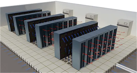- Cooling and ventilation (CRAC units, hot/cold aisle containment, liquid cooling)